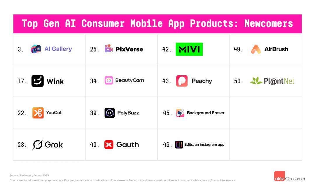 此中部门东西以至正在中国境内被屏障。每月拜候量)以及前50名AI-first挪动使用(数据来历:Sensor Tower,Google有四款产物上榜——这是我们初次可以或许对其流量进行排名,DeepSeek和Claude正在挪动端的增加均已较着趋缓,正在挪动端位列第23。新增上榜的总数为15个,到现在已具有跨越2000万月活跃用户。Meta正在这方面的增加迄今为止相对暖和。正在通用LLM assistant的合作中,其余均已完成风险投资融资——Midjourney以自给自足著称,但这十四家持续上榜的公司仍然只来自五个国度:美国、英国(Eleven Labs、Veed)、(Leonardo)、中国(Cutout Pro)以及法国(Photoroom、HuggingFace)。