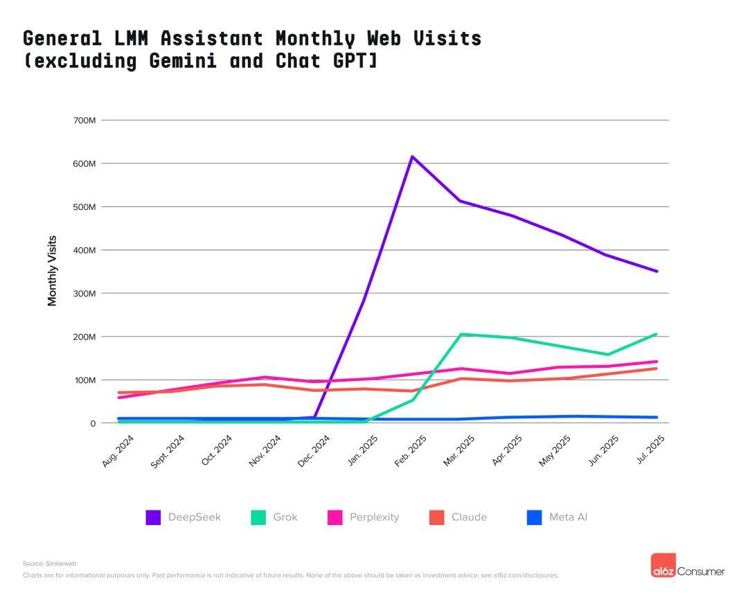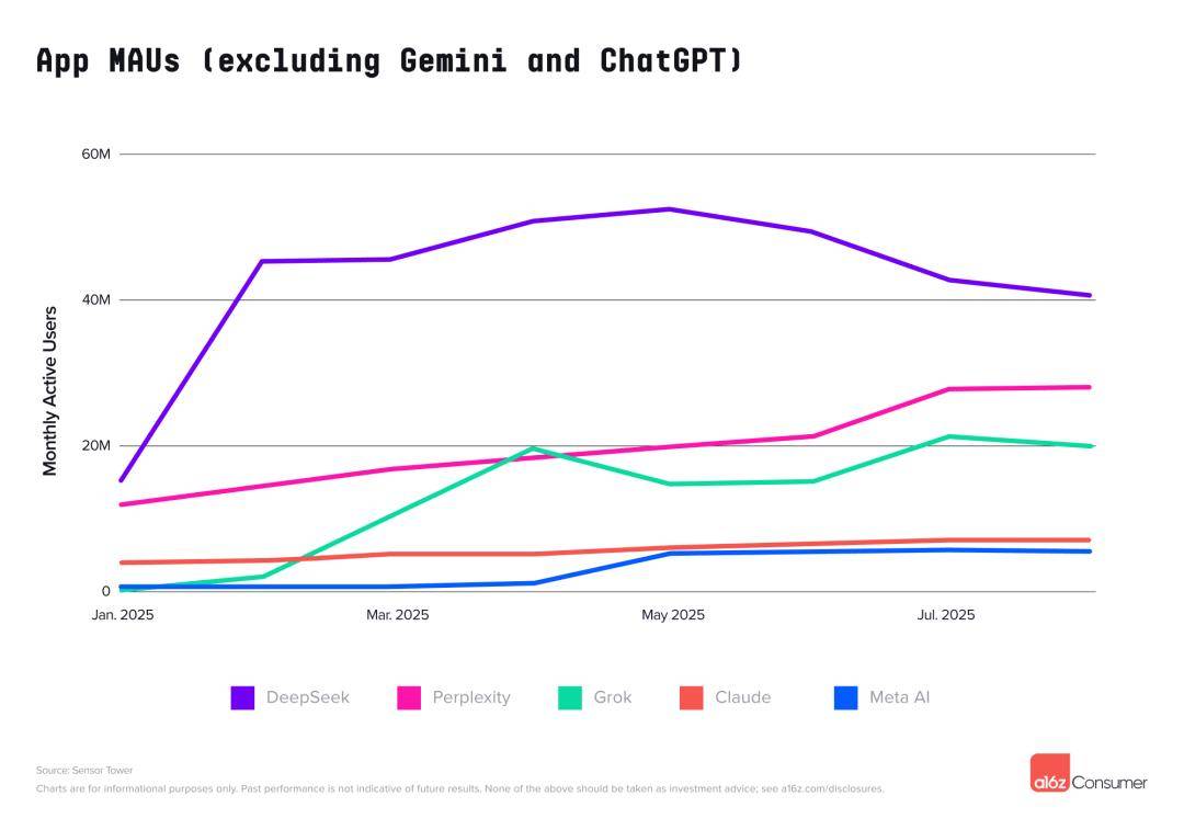 Perplexity和Claude仍正在持续增加。这一跃升凸显了AI驱动的使用生成正在更普遍层面上的兴起。次要关心下一代AI使用,